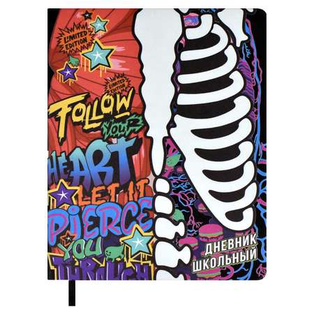 Школьный дневник - это стильный, модный и незаменимый аксессуар для каждого школьника. Используя этот дневник, ваш ребенок сможет организовать свою учебную жизнь и достичь успеха в школе. Стильный дизайн дневника позволит вашему ребенку выделиться среди своих одноклассников. Дневник имеет яркую обложку и удобный формат, который помещается в любую школьную сумку. Будьте успешными в школе с нашим дневником! Дневник школьный СКЕЛЕТОН СТРИТ (кожзам: А5+; твёрдый переплёт, материал обложки: искусственная кожа "Лейкер софт-тач"; декор: высокая полноцветная печать, полноцветная печать; способ крепления блока: ниткошвейный; вн. блок: 48 л., белый офсет 80 г/м², печать в одну краску, справочный материал: универсальная шпаргалка; закладка: одно ляссе; форзац: печать в одну краску; индивидуальная упаковка: ПЭТ-пакет)