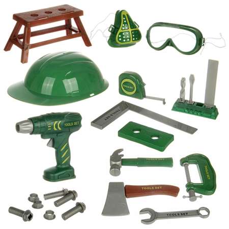 В комплекте каска, резинка к ней, шуруповерт, 5 элементов для сборки столика, топор, молоток, струбцина, комбинированный ключ, угольник, очки, респиратор, рулетка, подставка для инструмента, 3 сменные насадки для шуруповерта, элемент для скрутки, 4 болта, 4 гайки. Шуруповерт трещотка, при нажатии на кнопку издает звук трещотки, патрон прокручивается, насадки меняются. Болты можно вкрутить в элемент для скрутки с помощью шуруповерта и комбинированного ключа, гайки вкручиваются в болты. Рулетка выдвигается до 4 см, есть зажим. Респиратор и очки на резинках, очки без линзы. У струбцины крутится винт, можно закрепить ее на предмете. У каски есть отверстия для резинки.