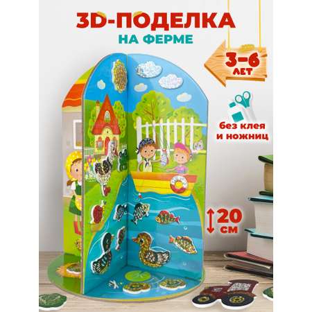 На каждой стороне 3D-поделки представлены разные части фермы (скотный двор, птичник, огород, пруд). Набор знакомит с обитателями фермы, деятельностью человека в деревне. Собрать поделку несложно: она складывается из трех частей без клея и ножниц. Детали из мягкого пластика с блестящим голографическим покрытием имеют липкий слой, нужно лишь приклеить их в подходящем месте. Игрушка, сделанная своими руками, станет прекрасным подарком родным и друзьям, украшением детской комнаты или экспонатом на выставке в детском саду. В комплекте: детали из картона (3 шт.), самоклеящиеся детали из ЭВА с голографической пленкой (2 листа). Возраст: 3-6 лет. Размер упаковки: 15х23х1,5 см. Размер собранной игрушки:15х15х20 см.Цены в интернет-магазине могут отличаться от розничных магазинов.
