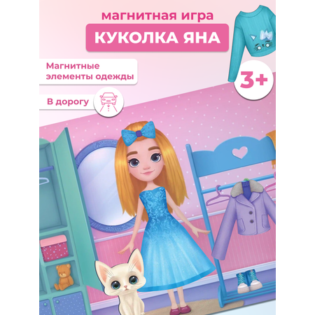 В набор магнитной игры входят различные элементы одежды и компактный планшет с игровым полем, на котором изображены куколка Яна, а также места для хранения одежды: шкаф, плечики, полочка для обуви.