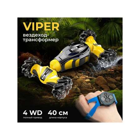 HIPER VIPER 4х4 полноприводная радиоуправляемая машинка перевёртыш, оснащенная всенаправленными-роликовыми колёсами, системой генерации пара и светодиодной подсветкой кузова, колёс и парогенератора. Машинка перевёртыш обладает внушительными размерами - целых 40 сантиметров крутости, безудержной силы и небывалой проходимости. Для генерации пара имеется специальный резервуар, в который необходимо залить обыкновенную воду, а чтобы появилась струя пара, нужно нажать на специальную кнопку и HIPER «VIPER 4х4» начнёт генерировать пар, который станет переливаться различными оттенками, из-за встроенных светодиодов. Управлять внедорожником можно не только с пульта управления, но и посредством жестов, при помощи браслета. Увлекательный процесс управления понравится не только детям, но и взрослым. И все это будет сопровождаться звуковыми эффектами работающего мотора, музыкой и яркой подсветкой, особенно эффектно заезды смотрятся в темноте. Благодаря всенаправленным-роликовым колёсам Mecanum HIPER «VIPER 4х4» может ехать боком и по диагонали, а также вращаться на 360 градусов, но и способен взбираться на небольшие преграды и преодолевать кочки и ухабы. Помимо роликовых колёс автомодель обладает ёмким аккумулятором, который обеспечивает до 25 минут работы на одном заряде. С помощью браслета, который фиксируется на ладони можно управлять внедорожником жестами одной руки, а также вкл/выкл парогенератор нажав на кнопку. При этом можно управлять не только направлением движения, но и изменять высоту подвески машины. Особенности: Генератор пара, Всенаправленные-роликовые колёса Mecanum, Управление жестами при помощи браслета, Два пульта управления, Звуковые и световые эффекты, Вращения на 360 градусов, Машинка трансформер, Функция демо режима, Время игры до 25 мин, Масштаб 1:12, Максимальная скорость до 15 км/ч, Прочные детали из АБС пластика / В комплекте 2 АКБ. Технические характеристики: Радиус действия: до 40 метров, Длина машины - 40 см, Ширина машины - 22 см, Высота машины - 9,4 см, Аккумулятор: Li-Ion 7.4В / 1200 мА, Вес автомодели: 935 г, Время игры: ~ 25 мин, Время зарядки аккумулятора: до 180 мин, Время зарядки ручного пульта управления: до 60 мин. В комплект входит: Радиоуправляемая машина HIPER VIPER 4х4, Стандартный пульт управления, Наручный пульт управления, Аккумулятор Li-Ion 7.4В / 1200 мАч - 2 шт, Кабель USB кабель для зарядки аккумулятора, Кабель USB кабель для зарядки наручного пульта управления, Емкость для воды, Инструкция, Отвёртка. Рекомендуется докупить: 2 батарейки AА.