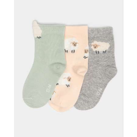 В комплекте Baby Gо три пары носков для девочки с объёмным декором в виде овечек - хаки, персиковые и серые.