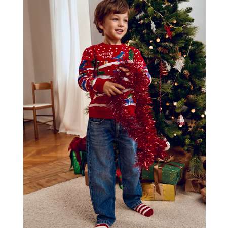 Красный новогодний джемпер для мальчика Futurino, декорированный цветным принтом с динозаврами.