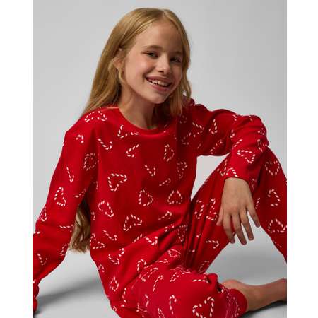 Красная новогодняя пижама для девочки Futurino из брюк и лонгслива с однотонным принтом.
