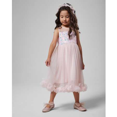 Пышное праздничное платье для девочки Orsolini в нежно-розовом цвете, с полупрозрачной вставкой и пайетками в верхней части. Юбка декорирована фатином с объёмной отделкой в виде лепестков на подоле.