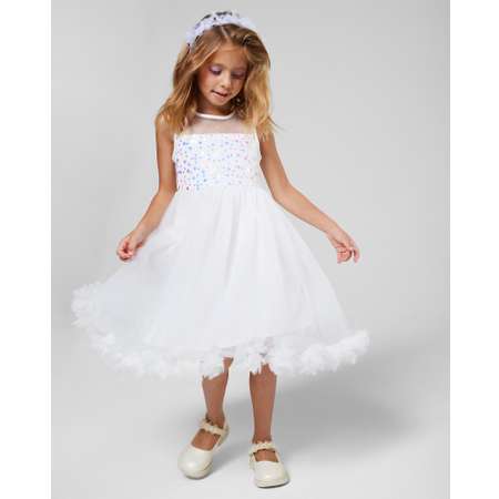Пышное праздничное платье для девочки Orsolini с полупрозрачной вставкой и пайетками в верхней части. Юбка декорирована фатином с объёмной отделкой в виде лепестков на подоле.