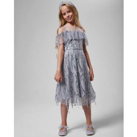 Праздничное серое платье для девочки Orsolini с открытыми плечами и декором в виде бахромы из пайеток.