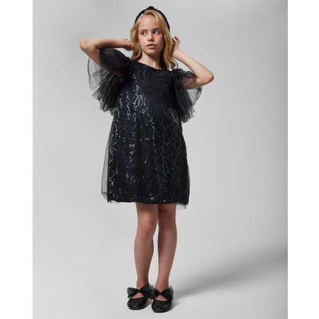 Чёрное праздничное платье для девочки Orsolini с пышными рукавами и узором из пайеток.