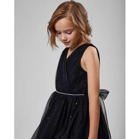 Чёрное праздничное платье для девочки Orsolini с блестящей пышной юбкой. Линия талии украшена тесьмой со стразами. Сзади вшитый пояс, завязывающийся в бантик.