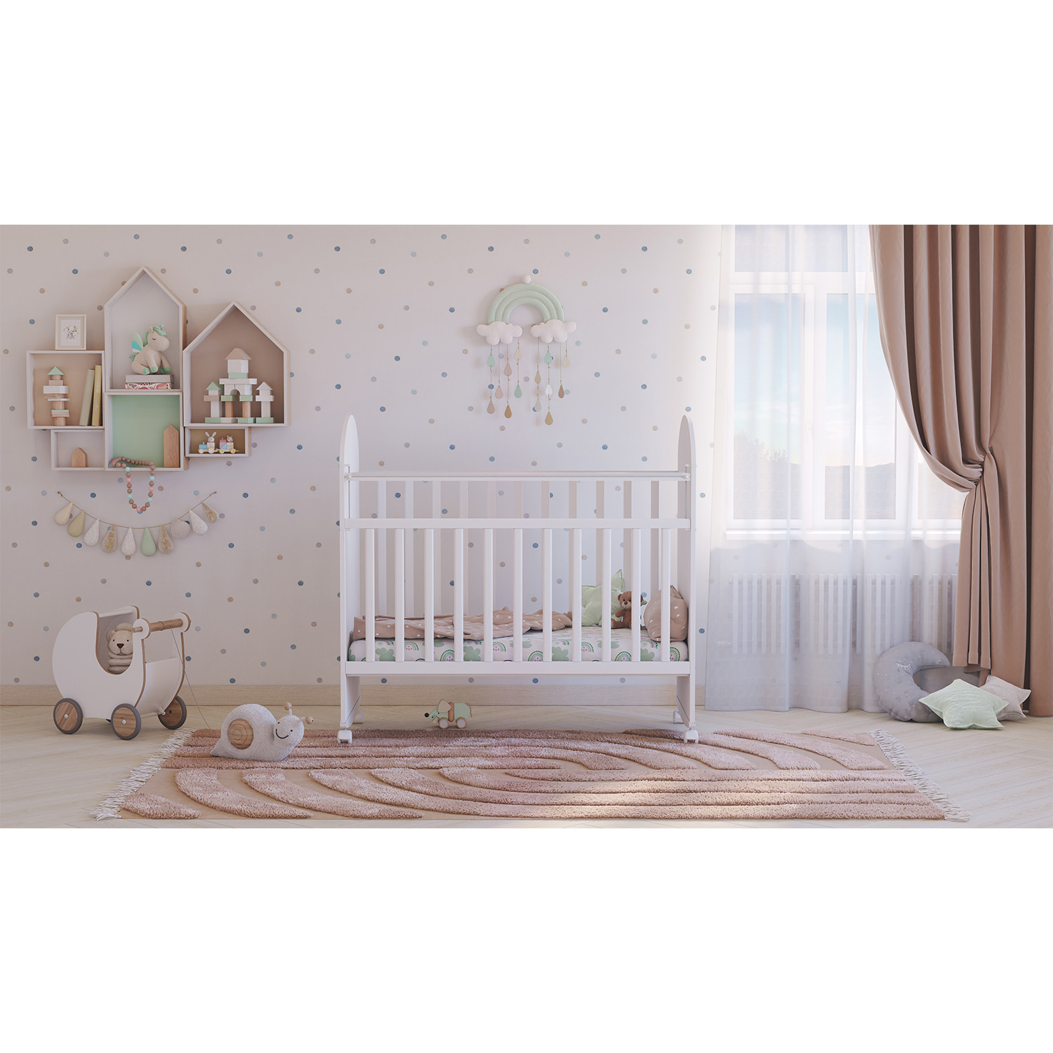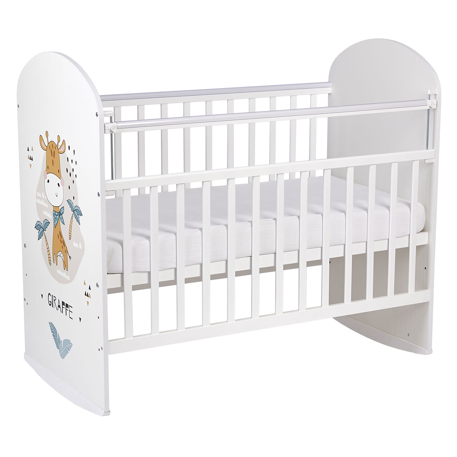 50 см (0-3 месяца), 40 см (3-6 месяцев), 30 см (6-36 месяцев). Данные указаны с учетом колес. Скругленная форма спинок обеспечивает безопасность и удобство при использовании. На боковом ограждении присутствует механизм опускания верхней планки «кнопка», который обеспечивает легкий доступ к младенцу. На боковых стенках предусмотрены накладки ПВХ «грызунки», защищающие малыша от травм десен и зубов. Благодаря наличию в комплекте колёсиков, два из которых идут со стопором, кроватки являются мобильными, и их можно бесшумно перемещать в любое удобное место без особых усилий. Модели оснащены полозьями для качания, обеспечивающими мягкие и плавные движения. Для доступа к полозьям необходимо отсоединить все 4 колеса. Кроватки изготовлены из высококачественного ЛДСП и экологически чистого и прочного массива березы, который покрывается защитным лакокрасочном покрытием, не создающим вредных испарений.