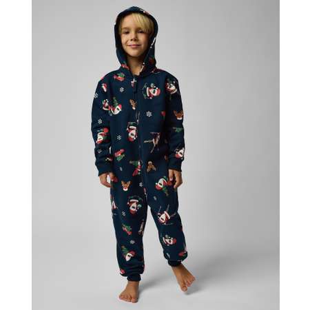 Тёмно-синий новогодний комбинезон для мальчика Futurino с цветным принтом "дед мороз на лыжах".