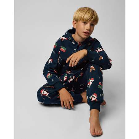 Тёмно-синий новогодний комбинезон для мальчика Futurino с цветным принтом "дед мороз на лыжах".