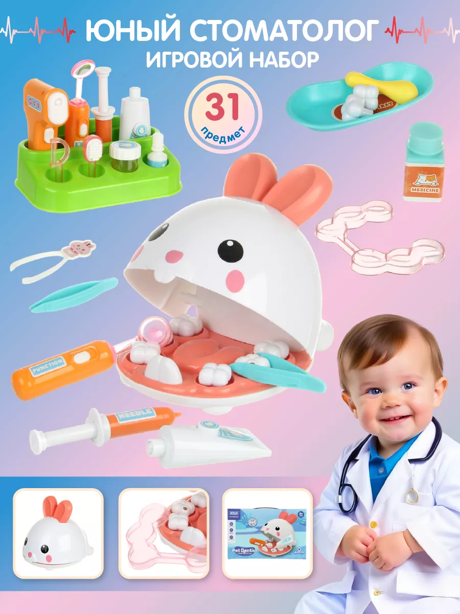 В детский набор зубного врача входят голова зайки, 8 съемных зубов, подставка под инструменты, градусник, врачебное зеркало, шприц, тюбик зубной пасты, 2 сменные насадки, баночка с крышкой, 2 бутылочки, капа, лоток, ступка с пестиком, чашка, пинцет, щипцы, 2 фигурки еды, наклейки.