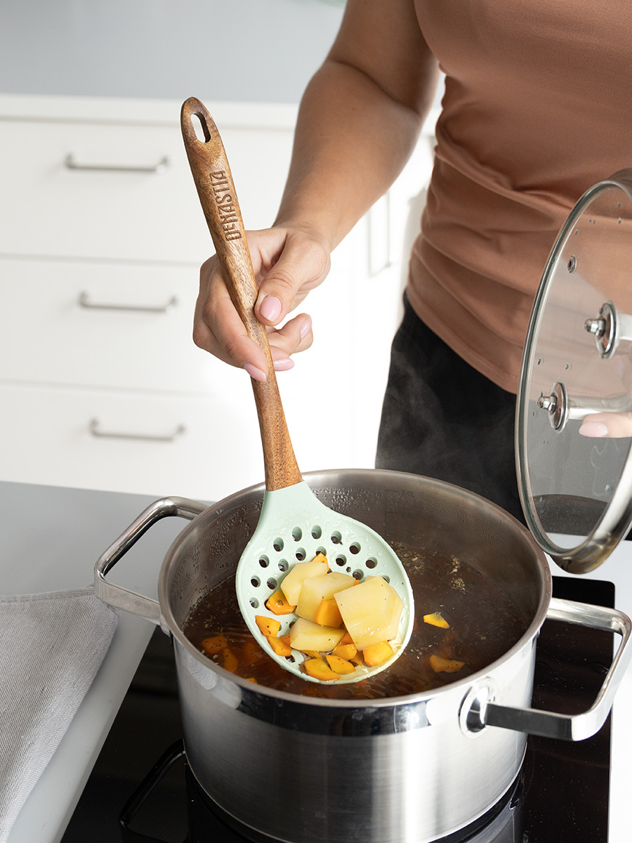 Шумовка DeNASTIA силикон с ручкой из акации 34x10 см мятный A000145