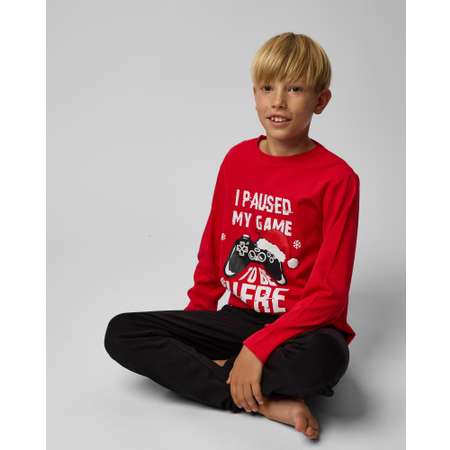Новогодняя пижама для мальчика Futurino из чёрных брюк и красного лонгслива с цветным принтом.
