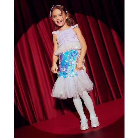 Карнавальный костюм для девочки Grimmo Русалка из двух предметов: ободка с объёмным блестящим декором и цветного ярусного платья с оборками и пайетками.
