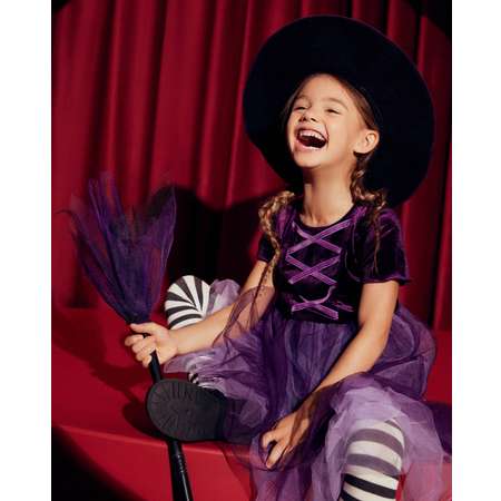 Карнавальный костюм Grimmo Ведьма в фиолетовом цвете из трёх предметов: велюрового платья с пышной юбочкой, конусной шляпы и метлы. Для тематических вечеринок в стиле Хэллоуин.