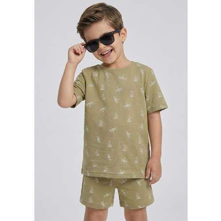 Комплект летний для мальчика состоит футболки и шорт. Пояс шорт на резинке и шнурке.