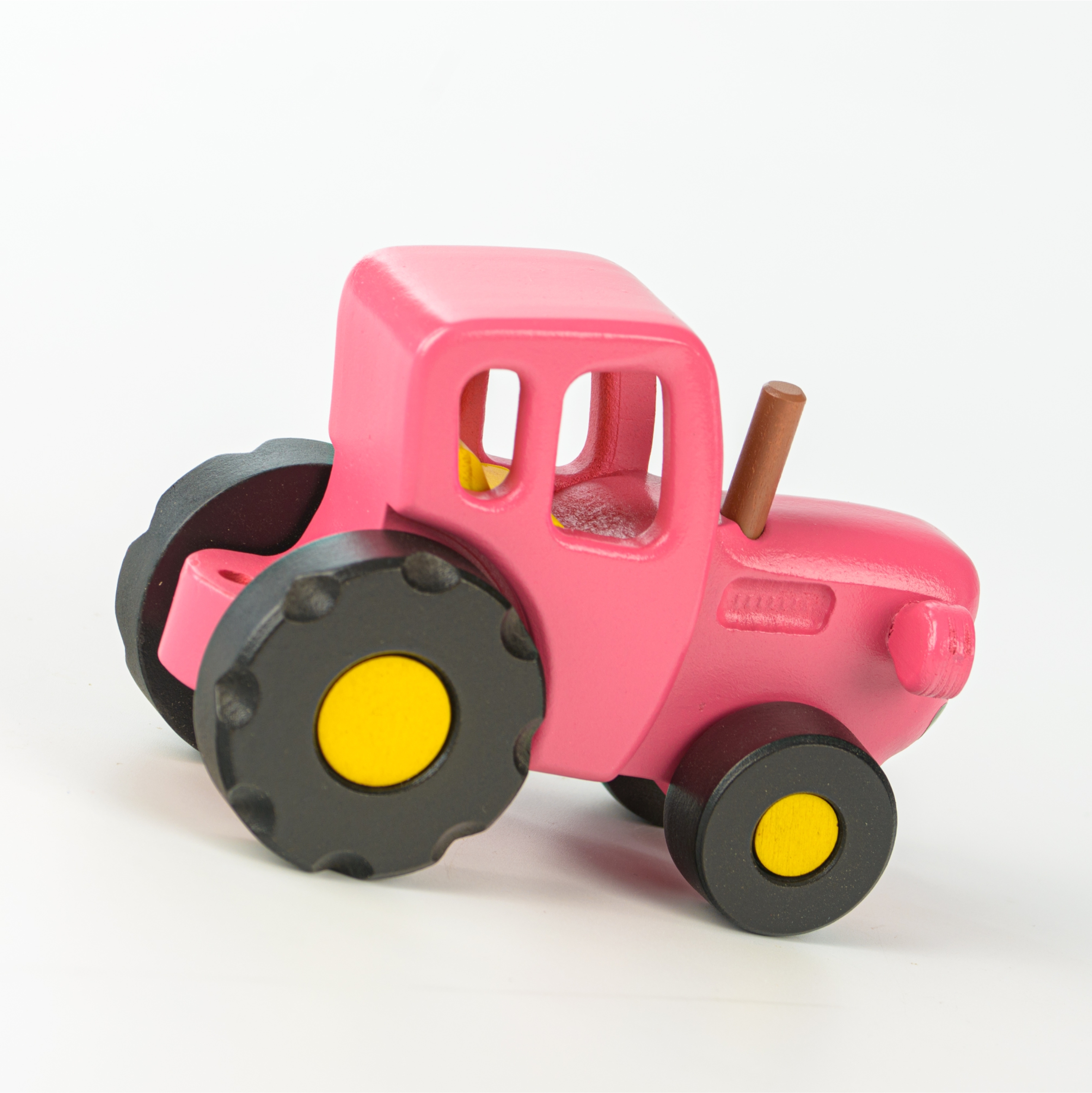 Игрушечный розовый трактор Мила из дерева как в мультфильме Синий трактор. Трактор прост в управлении, его колеса крутятся. У машинки есть крепление для ковша или прицепа и телеги для домашних животных (продаются отдельно).