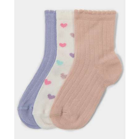 В комплекте Baby Gо три пары носков в рубчик для девочки - фиолетовые, розовые и белые с цветными сердечками.