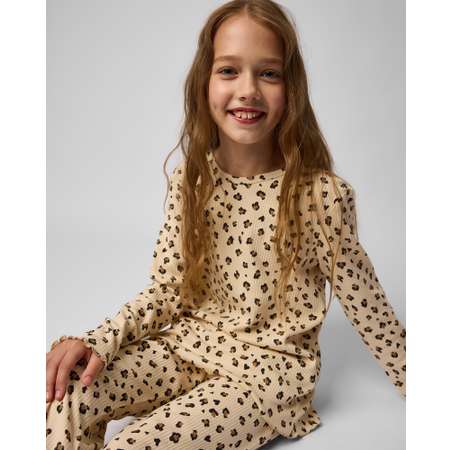 Леопардовая пижама для девочки Day and Night в бежевом цвете из лонгслива и брюк в рубчик.