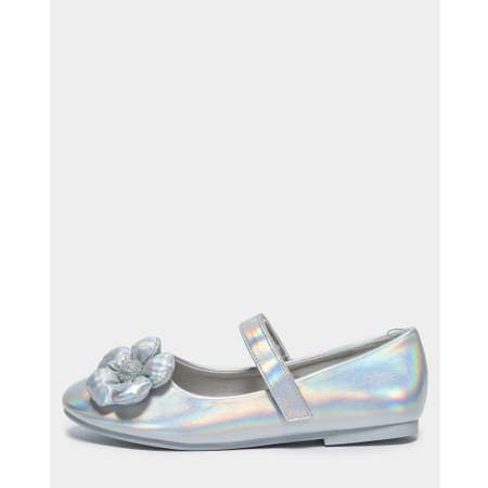 Праздничные туфли для девочки Futurino в стиле мери-джейн. Выполнены в серебристом цвете с голографическим эффектом. Дополнены объёмным цветочным декором.