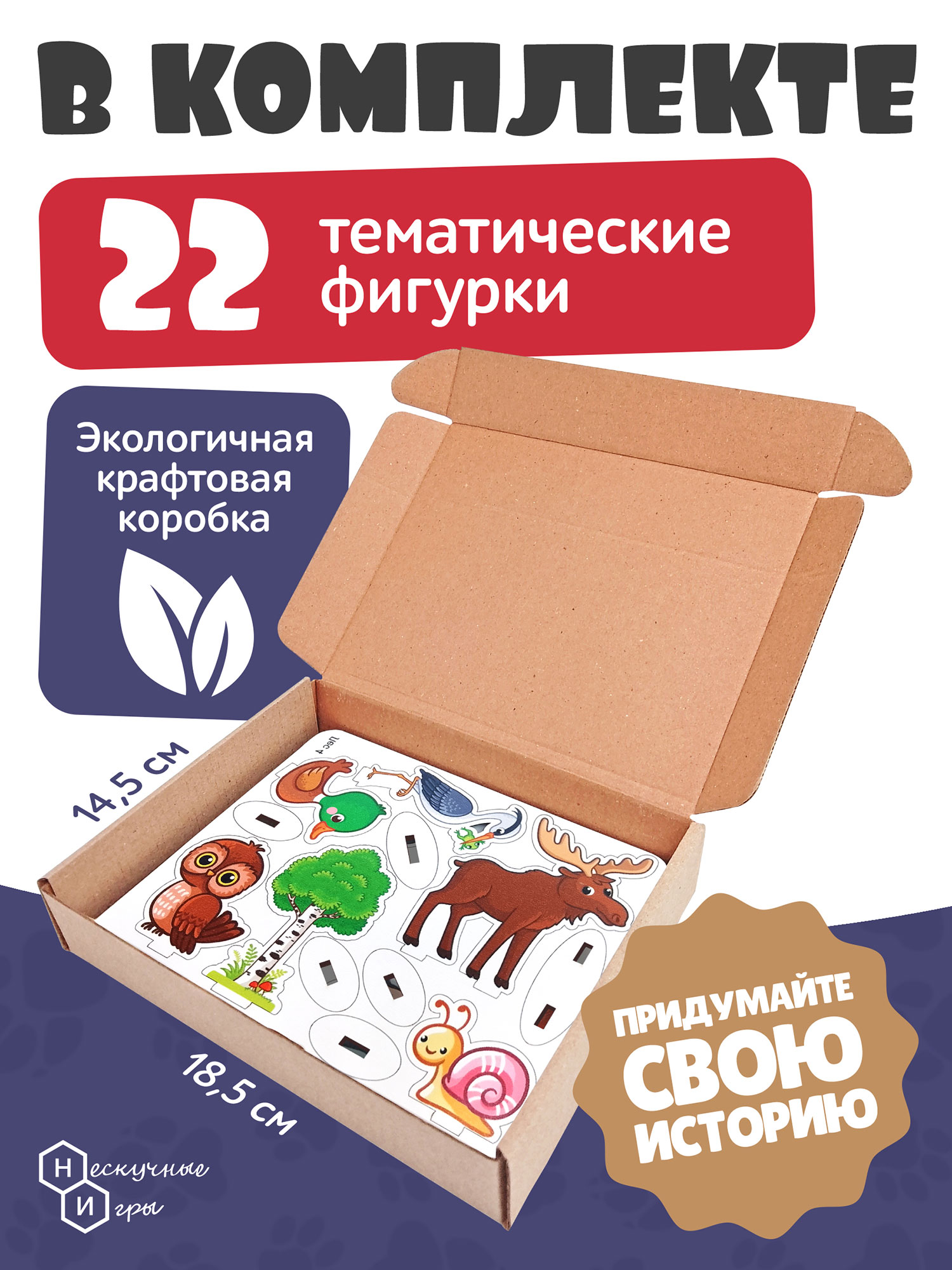 В наборе представлены 22 деревянные двусторонние фигурки: Берёза Бобр Корзнина Крот Медведь Муравей Лиса Заяц Ель Грибник Волк Ёж Енот Рыбак Лягушка Олененок Кузнечик Лось Сова Утка Улитка Аист