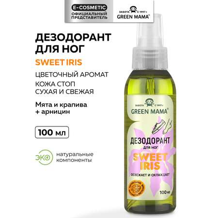 Спрей быстро впитывается, не оставляет липкости и следов, поддерживая ощущение сухости и свежести на длительное время.Дезодорант для ног SWEET IRIS (СВИТ ИРИС) создан на основе натуральных эфирных масел, обладает нежным и изысканным ароматом. Он идеально подходит для женщин, не оставляет ощущения липкости, на долго сохраняет кожу сухой и свежей. Натуральная вытяжка арники, дополненная экстрактами мяты и крапивы, активно противодействуют появлению неприятного запаха стоп, смягчает и освежают кожу. Благодаря веществу "арницин", содержащемуся в соцветиях арники горной, дезодорант Грин Мама повышает сопротивляемость кожи внешним негативным факторам и стрессу.
