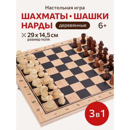 Классическая игра 3 в 1: шахматы, нарды, шашки. Шахматы - настольная игра, предназначенная как для детей в возрасте от 6 лет, так и для взрослых. Подобные игры развивают у детей внимательность, наблюдательность, память, мелкую моторику рук и пальцев. Взрослым подобный игровой процесс помогает отвлечься от будней, сосредоточиться на решении непростых логических задач, развивает стратегическое мышление. Игра в нарды также поспособствует развитию стратегического мышления и пространственного воображения, улучшит память и математические способности, научит концентрироваться. Шахматное поле и фигуры выполнены из дерева. Размер поля 29х14.5х3 см. Размеры фигур: король 5,4 см, пешка 2,7*1,5 см. Также в наборе есть деревянное поле для игры в нарды и фишки к нему, кубики и шашки.
