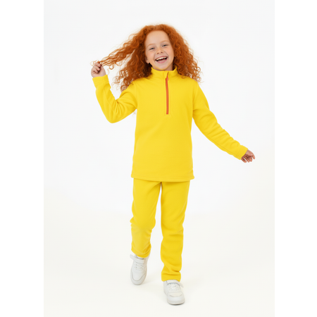 Особенности модели: флисовый детский костюм состоит из брюк и толстовки. Воротник‑стойка у кофты закрывает горло, планка на молнии защищает подбородок и шею, есть защитный клапан для бегунка и удобный пуллер. Штаны прямого кроя с эластичной резинкой в поясе обеспечивают комфортную посадку по фигуре. Костюм сшит в жёлтом цвете, подойдёт как флисовый костюм для девочки и как толстовка и брюки для мальчика.