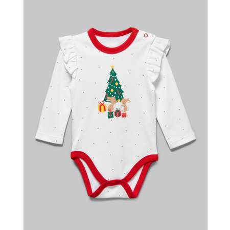 Новогоднее белое боди для девочки Моя Горошинка с оборками и цветным принтом.
