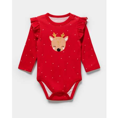 Красное новогоднее боди для девочки Моя Горошинка, декорированное оборками и цветным принтом с блёстками.