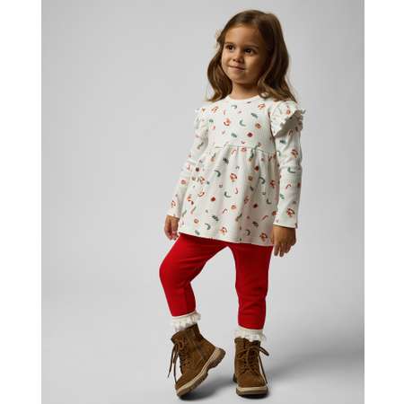 Новогодний комплект для девочки Моя Горошинка из красных однотонных легинсов и белой туники с оборками и цветным принтом.