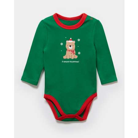 Зелёное новогоднее боди для мальчика Моя Горошинка с цветным принтом "Я лучший подарочек!".