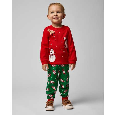 Новогодний комплект для мальчика Моя Горошинка из красного лонгслива и зелёных брючек. Изделия декорированы цветным принтом.