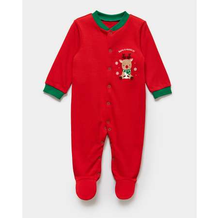 Красный новогодний комбинезон для мальчика Моя Горошинка, декорированный цветным принтом.