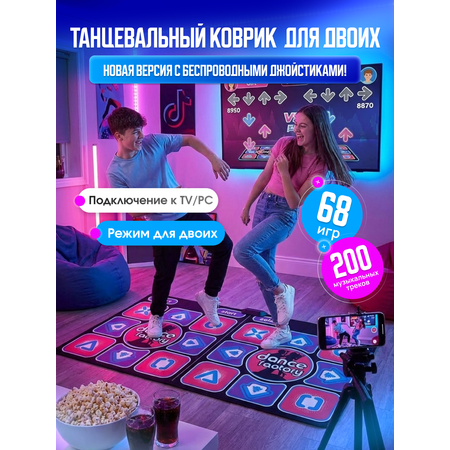 Новый танцевальный коврик для двоих с беспроводными джойстиками! Представляем вам обновленную модель музыкального коврика для детей и взрослых с улучшенной графикой. Танцевальный коврик для телевизора и ПК можно использовать для игр вдвоем, танцев, занятий спортом. Интерактивный коврик подходит для занятий аэробикой, йогой или фитнесом, игр с детьми и танцев, так как на нем загружено более 200 программ, из них 68 игр.