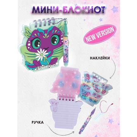 Мини-блокнот для записей на пружине в виде персонажа Галактики Nebulous Stars - сказочного питомца. Яркий дизайн и разлинованные страницы с принтами. Отдельная страница с яркими наклейками и мини-ручка в комплекте.