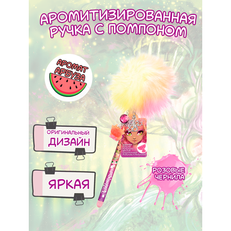 Оригинальная шариковая ручка с ароматизированными чернилами (вкусом арбуза) и принтом с изображением звёздочки. Ручка украшена большим ярким меховым помпоном, подвеской с кристаллом и кулоном в виде сказочного питомца, а также стильным брелоком в виде форме Nebulous Stars.