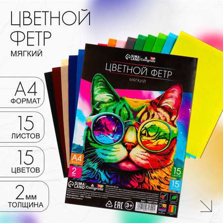 В наборе вы найдёте 15 листов мягкого фетра формата А4 толщиной 2 мм и 15 насыщенных цветов.
