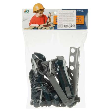 Комплектация. Пассатижи, газовый ключ, топор, разводной ключ, гаечный ключ, канцелярский нож, накидной ключ, отвертка с 4 насадками, рулетка, 3 болта, 3 гайки, 2 уголка элемента для скрутки, трещотка для торцевых головок с насадкой. 23 предмета.