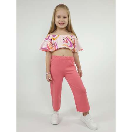 Штаны в стильном принте - неотъемлемая часть этого легкого и уютного комплекта. Брючный костюм с коротким топом с крылышками на пройме подчеркнет индивидуальность маленькой модницы, добавит красок в ее образ. Топ сочетается с брюками и создает завершенный вид нарядного ансамбля.