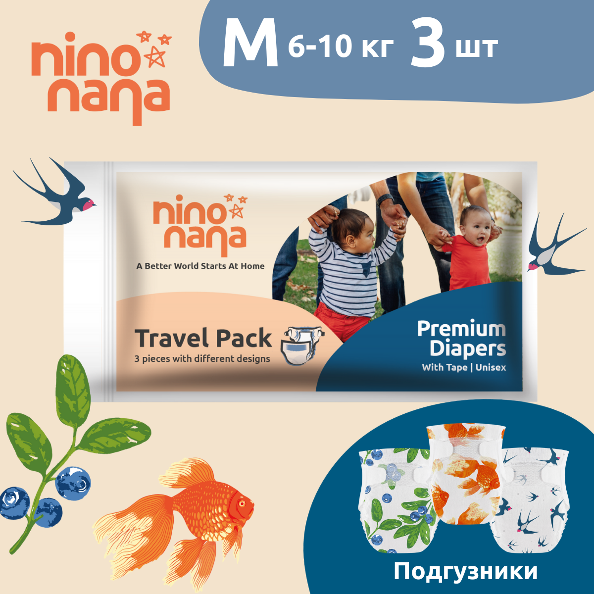 Тревел Пак подгузников Nino Nana включает в себя 3 расцветки: Ягодки, Рыбки, Птички в следующих размерах: