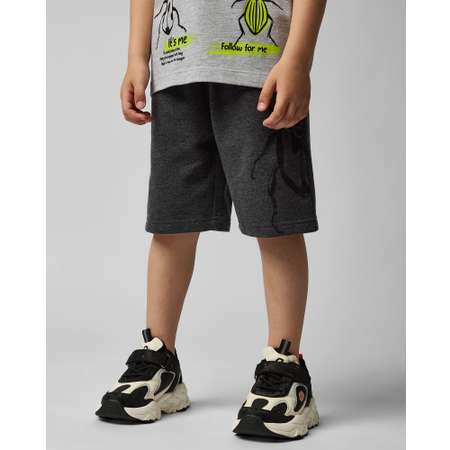Тёмно-серые шорты для мальчика Futurino, декорированные принтом с жуком и яркой нашивкой.