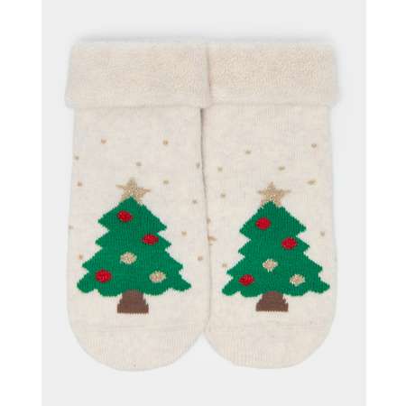Махровые новогодние носки для девочки Моя Горошинка бежевого цвета, декорированные принтом с люрексом "новогодняя ёлка".
