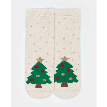 Махровые новогодние носки для девочки Futurino бежевого цвета, декорированные принтом с люрексом "новогодняя ёлка".