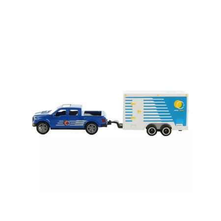 Машинка с фургоном. Игрушечная машинка имеет металлический корпус и прорезиненные колеса.