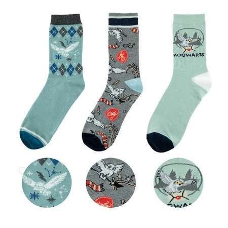 Две пары носков из этого набора выполнены в более минималистичном стиле и украшены изображениями совы. Третья пара носков украшена узором, объединяющим Буклю с культовыми очками Гарри Поттера, символом факультета Гриффиндор и шарфом Гриффиндора.