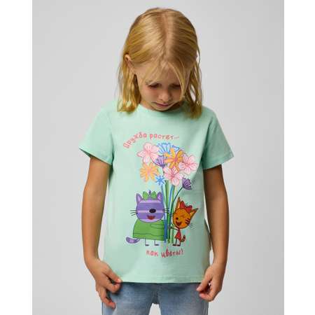 Зелёная футболка для девочки Три Кота с красочным принтом "Карамелька и Горчица".
