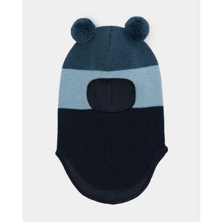 Синяя шапка-шлем для мальчика Baby Go в широкую полоску и ушками-помпонами.